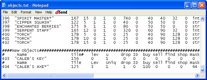 It is extremely important to always maintain the integrity of the order and numbering of each row in your lists of data. If you insert or remove an object in the middle of the objects.txt file, then all objects after the change will require re-numbering, and everywhere you refer to those objects from somewhere else (such as in a map, or a character's inventory), you will have to modify the object number reference. For this reason, you must scroll to the bottom of the file before inserting our new objects.