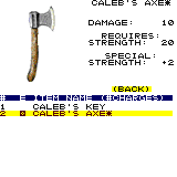 ####New Objects########################################################################################################################################################## # Name tile# lev u drop ID buy sell find shop mask det req_attrib min bonus val type code Accur 403 "CALEB'S KEY" 156 0 1 0 0 0 0 0 0 0 0 strength 0 intelligence 0 Misc 1 0 # Name Tile Lev Uniq drop ID buy sell find shop mask det attrib val bonus val type phys fire magic special accuracy 404 "CALEB'S AXE*" 125 3 1 1 0 100 0 0 0 64 0 strength 20 strength 2 HandWeapon 10 0 0 0 1